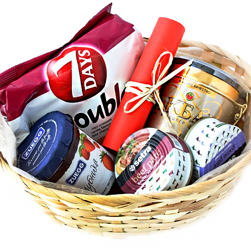 Состав: корзина, поздравление металлургам, варенье, 2 банки французского паштета, круассаны, чай Акбар Голд ж/б.