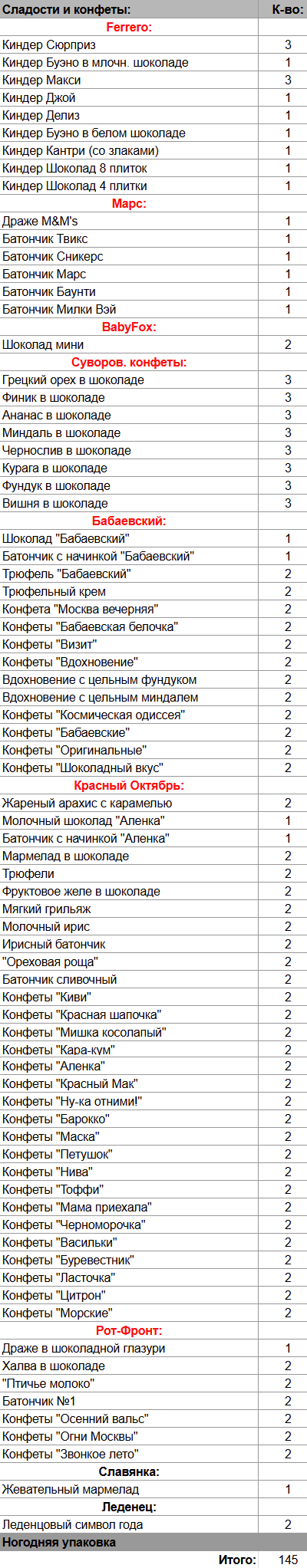 Кол-во сладостей: 145 шт.